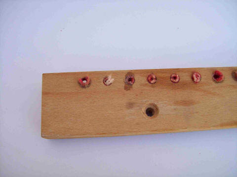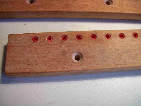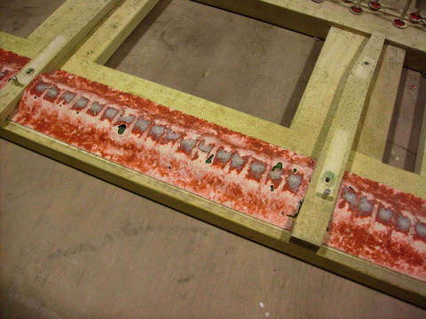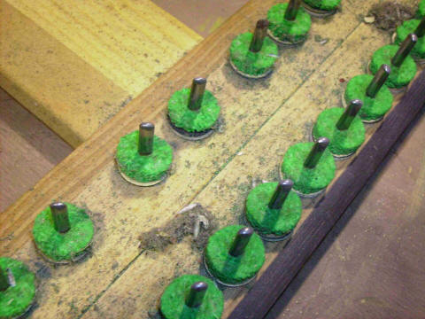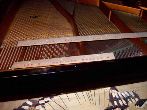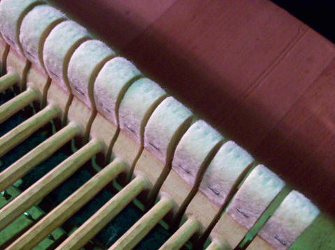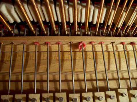 Los alambres de los apagadores (verticales) se deslizan dentro de unos orificios en donde se encuentran encolados los bujes (los paños rojos). Se puede observar que algunos faltan, evidenciándose también que algunas reparaciones fueron realizadas de urgencia ya que no se desmontó el riel de madera.