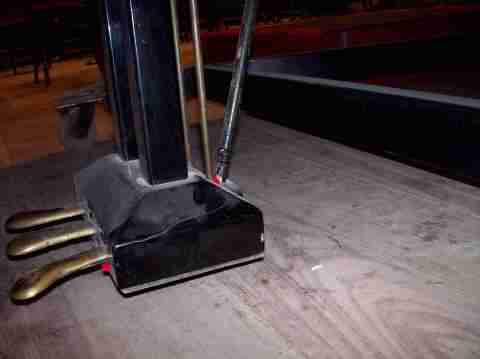 Apagadores y guías de apagadores fuera del piano para remoción de paños y bujes de apagadores     Base de la pedalera del lado interno: en los paños (gastados y duros) se apoyan los pedales cada vez que se sueltan. Los paños, al encontrarse en estas condiciones provocaban que el ruido de la caída del pedal no se amortiguara