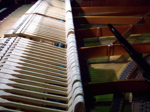 2) En esta segunda etapa y luego de poder evaluar a ciencia cierta el resultado de la sonoridad del piano, se puede dar el siguiente paso que es la renovación total de todos los fieltros de apagadores, fieltro de apoyo, arandelas de nivelación de teclado y calado de tecla. Cambio de cabezas de martillo, entonación completa, grafitado de pulsadores, blanqueado de marfiles del teclado, regulación de la máquina, cambio de los fieltros de guía de apagadores y cambio de todos los fieltros de mortezas de teclado. Reposición de bordona faltante y limpieza del encordado.
